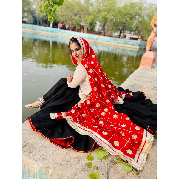 “Red Haryanvi Ethnic Wear Set – Gotta Phool Design Daman, Blouse & Chunni”