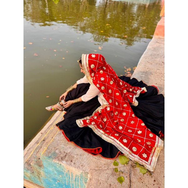 Black Cotton Daman with Red Reza, White Kurti & Red Gota Work Dupatta