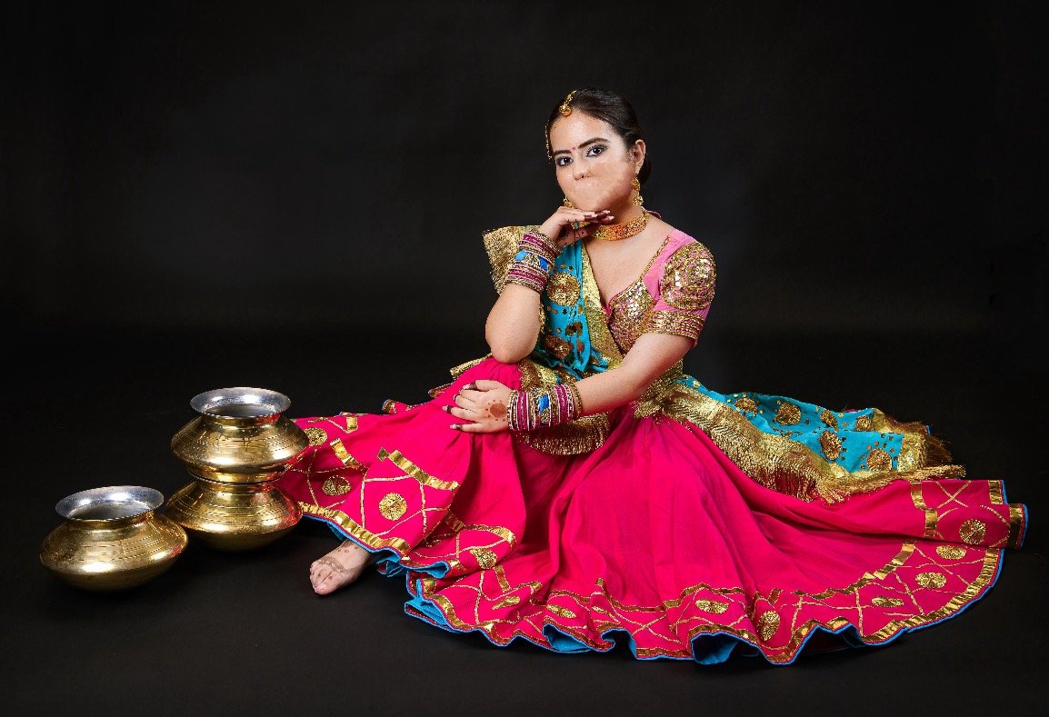 Paired with a white cotton Kurti featuring a classic collar neck and rounded hem, which balances the boldness of the Daman and completes the traditional ensemble gracefully.