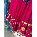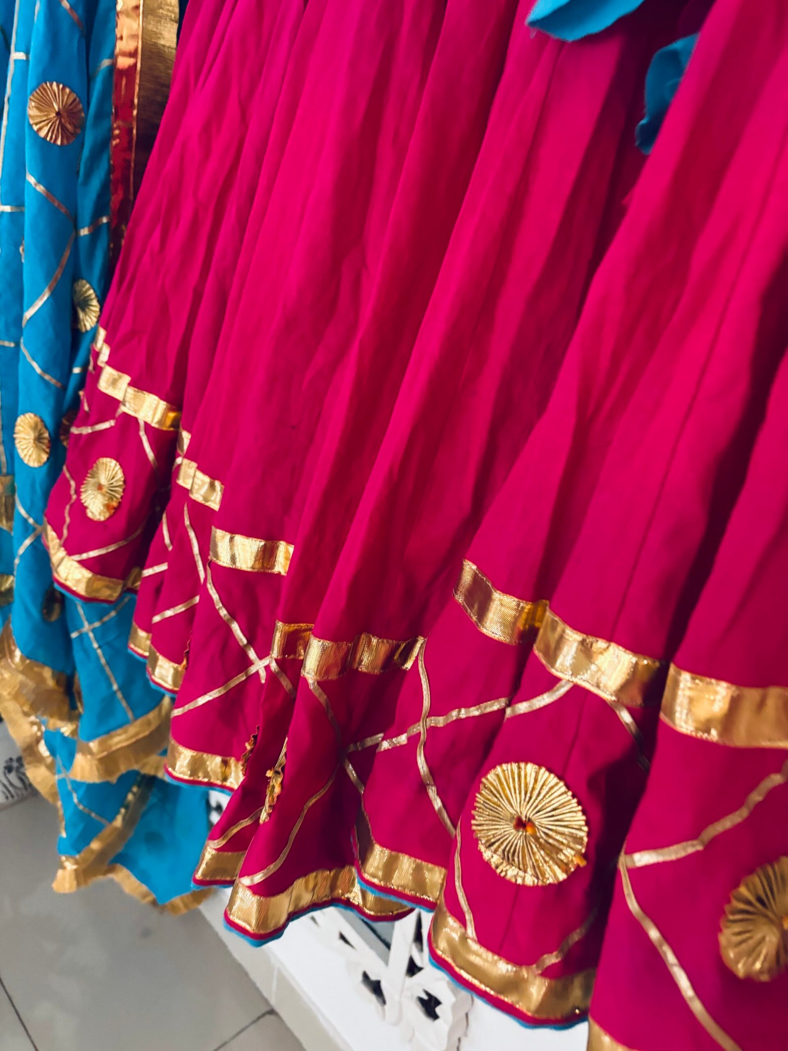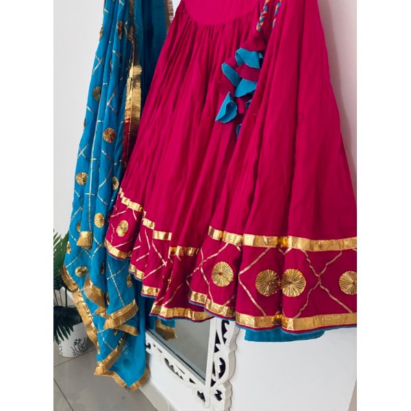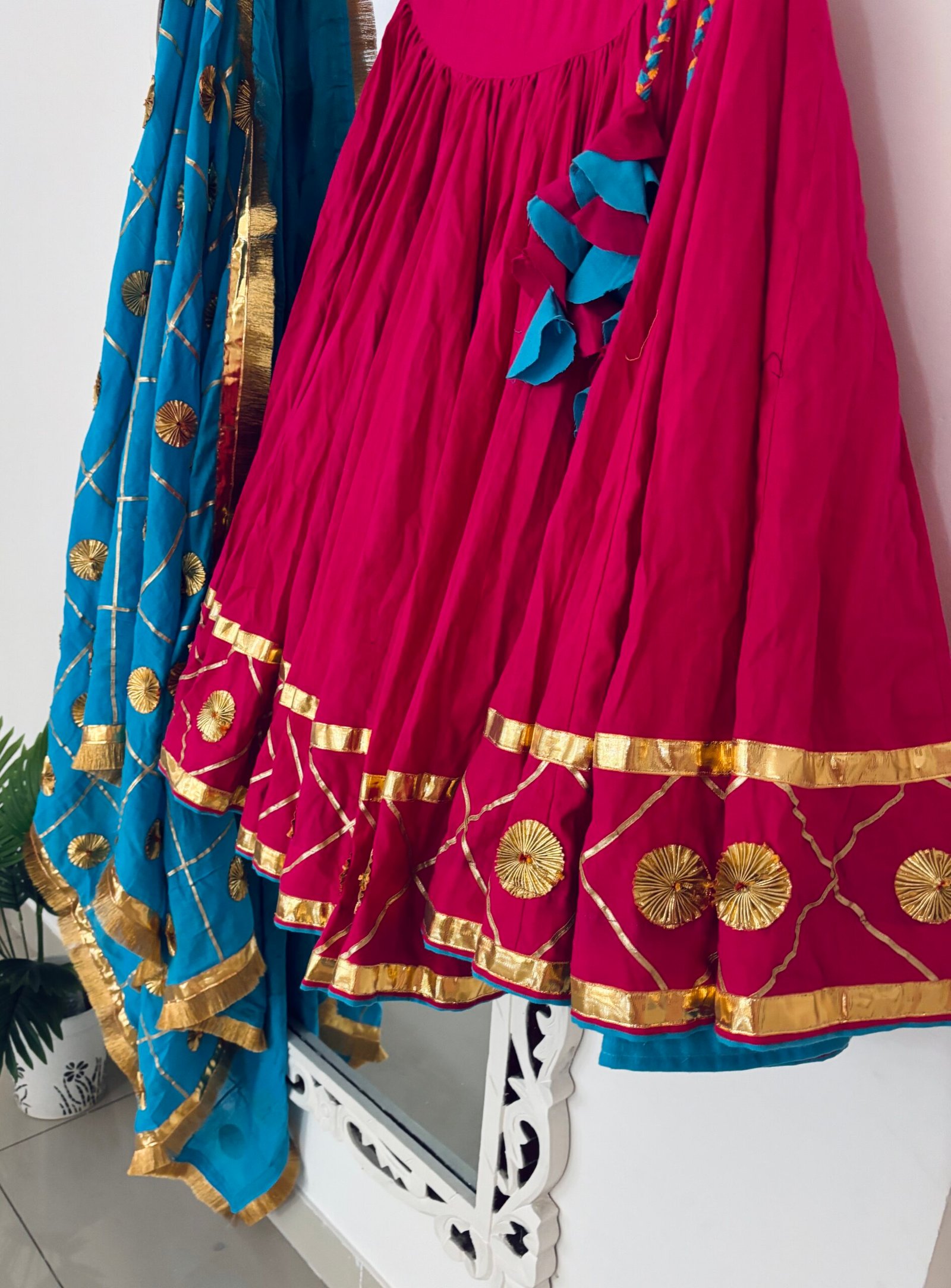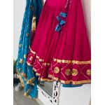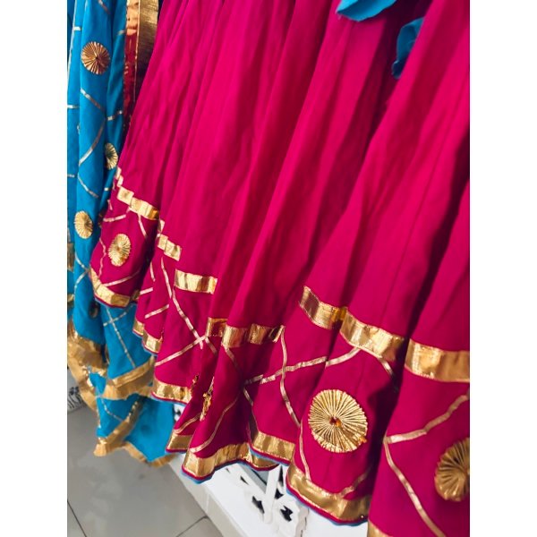 Crafted in pure cotton fabric, this Daman comes in a vibrant pink shade, beautifully embellished with golden Gota work and multicolour piping. The bottom hem is enhanced with a stitched 3–4 inch wide Laman in sky blue Reza fabric, giving it a rich and structured finish. - Dupatta: