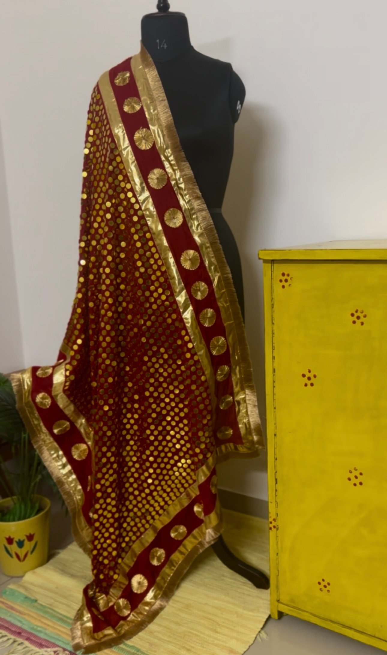 Step into the spotlight with this stunning Royal Red Sitara Dupatta, where tradition meets elegance. Every inch of this masterpiece is a tribute to Haryanvi craftsmanship, featuring thousands of hand-stitched golden Sitara intricately detailed by our skilled women artisans