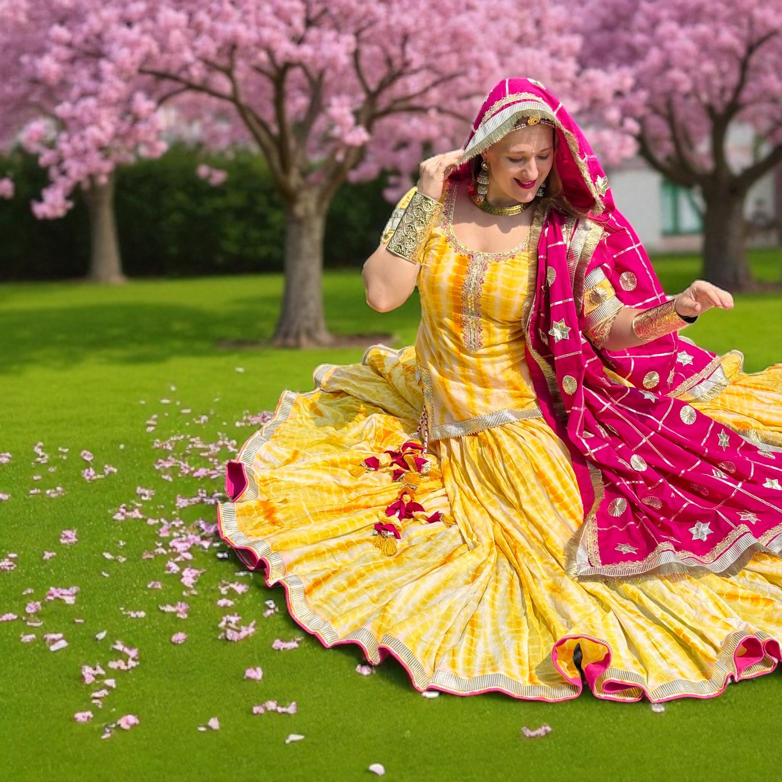 Tie-Dye Yellow Malmal Cotton Ghagra & Kurti – Haryanvi Elegance with Rajasthani Charm