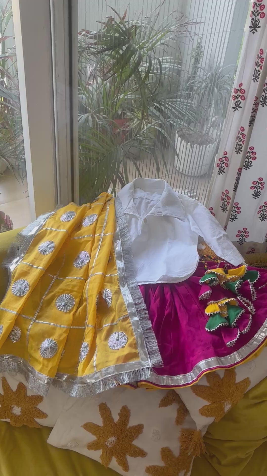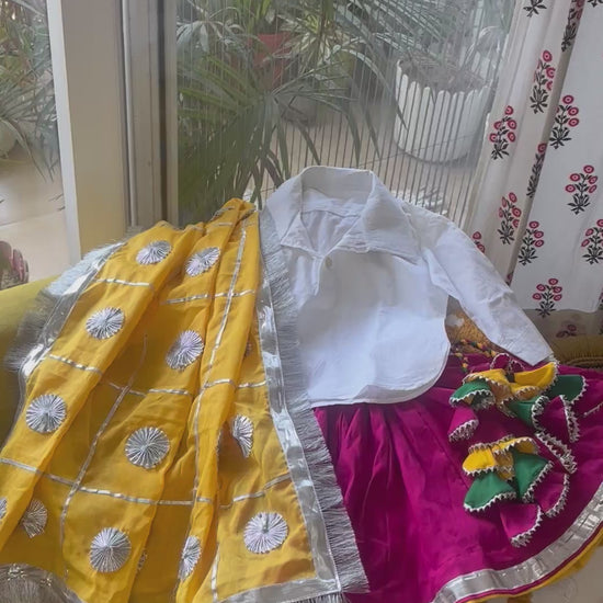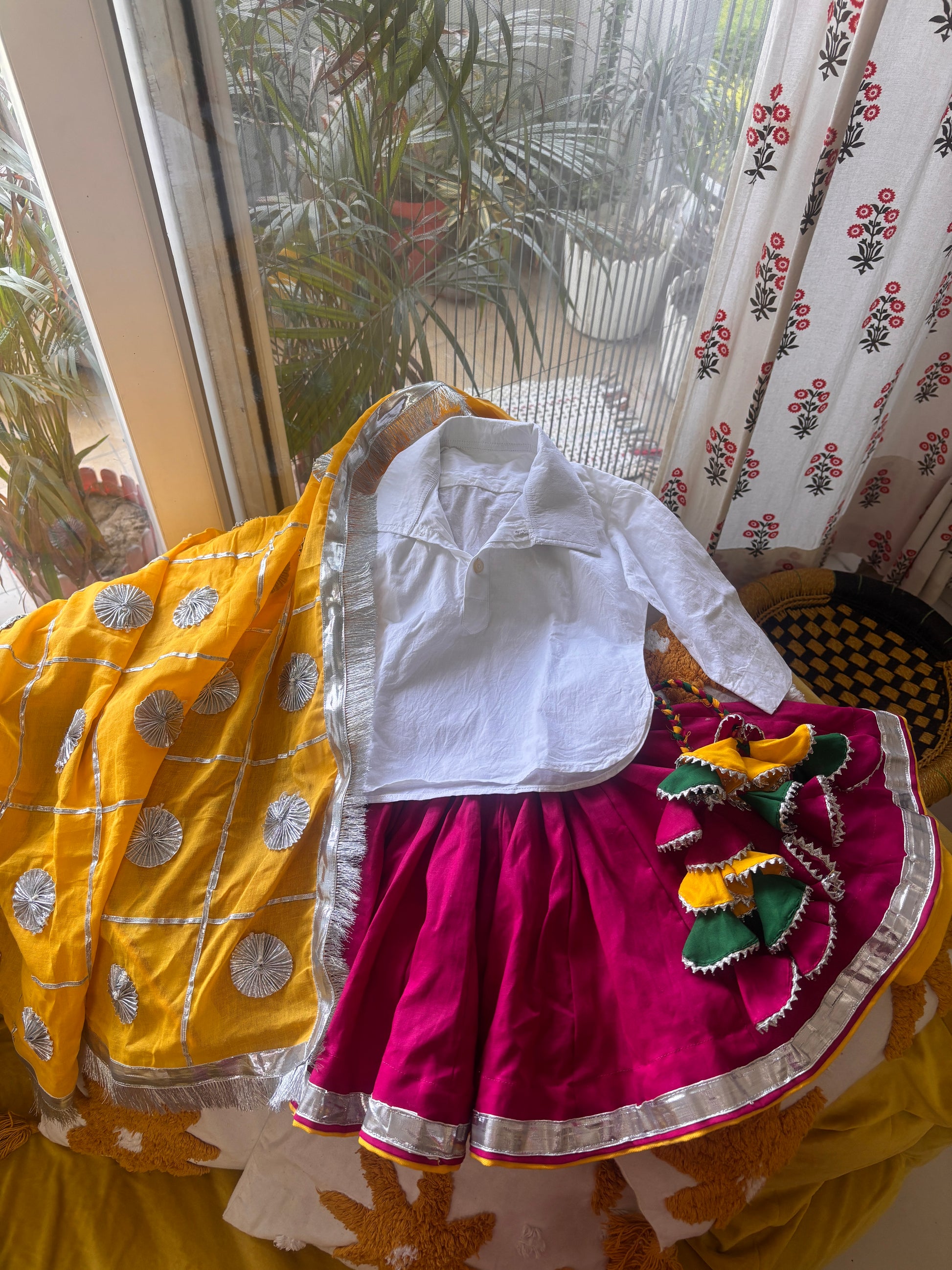 Beautiful pink cotton Haryanvi Daman Kurti Chunni set for girls with yellow Reza laaman border, white cotton kurti, and yellow dupatta with silver gota work. Authentic handmade traditional kids dress by Dhaakad Bazaar.